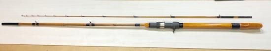 ガイドは、CMNST〜KT〜KWを使用。トリガー付きパイプシート仕様です。丸節竹とソリッドグラス、桧グリップを使用しています。錘負荷は30〜60号。